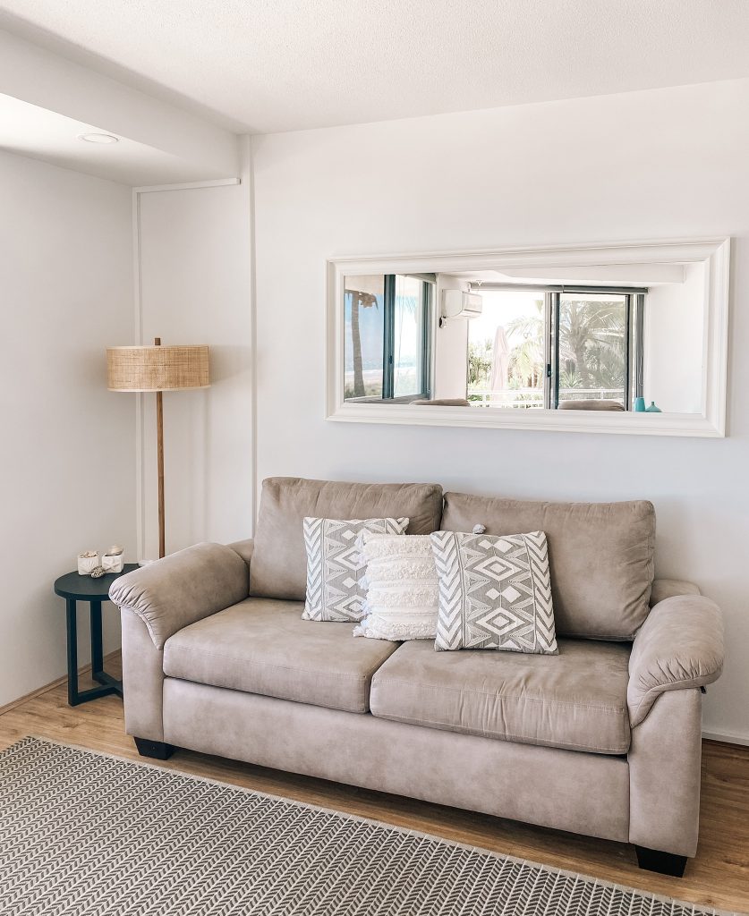 This ground-floor apartment features beautiful floating timber floors throughout, a comfortable leather lounge with two recliners, and a spacious balcony offering beach views and a northerly outlook toward Surfers Paradise.